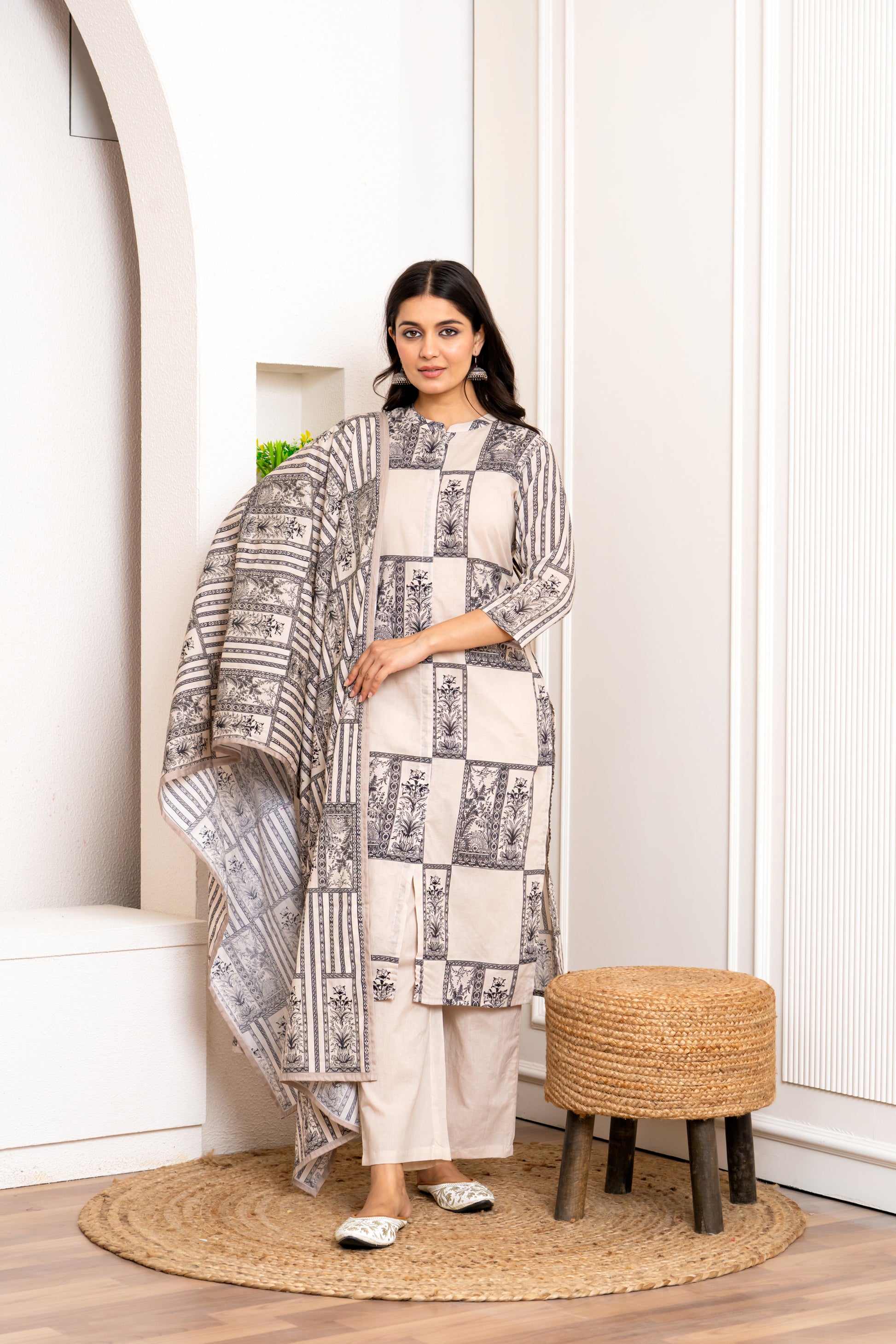 This Blue and White Printed Kurti Set features a classic block pattern crafted from breathable cotton, making it a comfortable choice for fancy wear occasions. The crisp contrast of black and white gives it an elegant yet timeless appeal, suitable for both casual and semi-formal gatherings. Its lightweight fabric ensures ease of movement while maintaining a polished look, perfect for those seeking style with comfort.