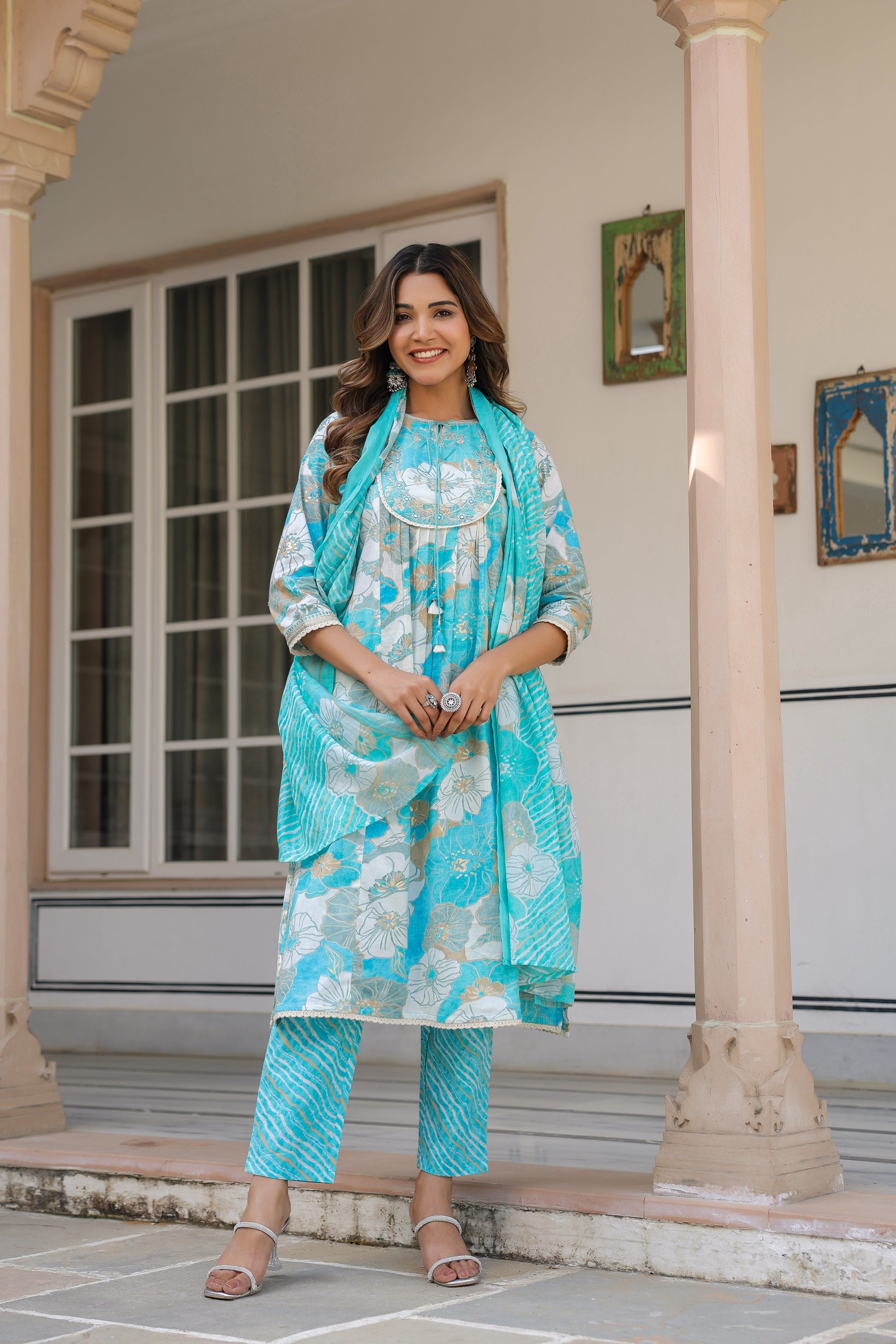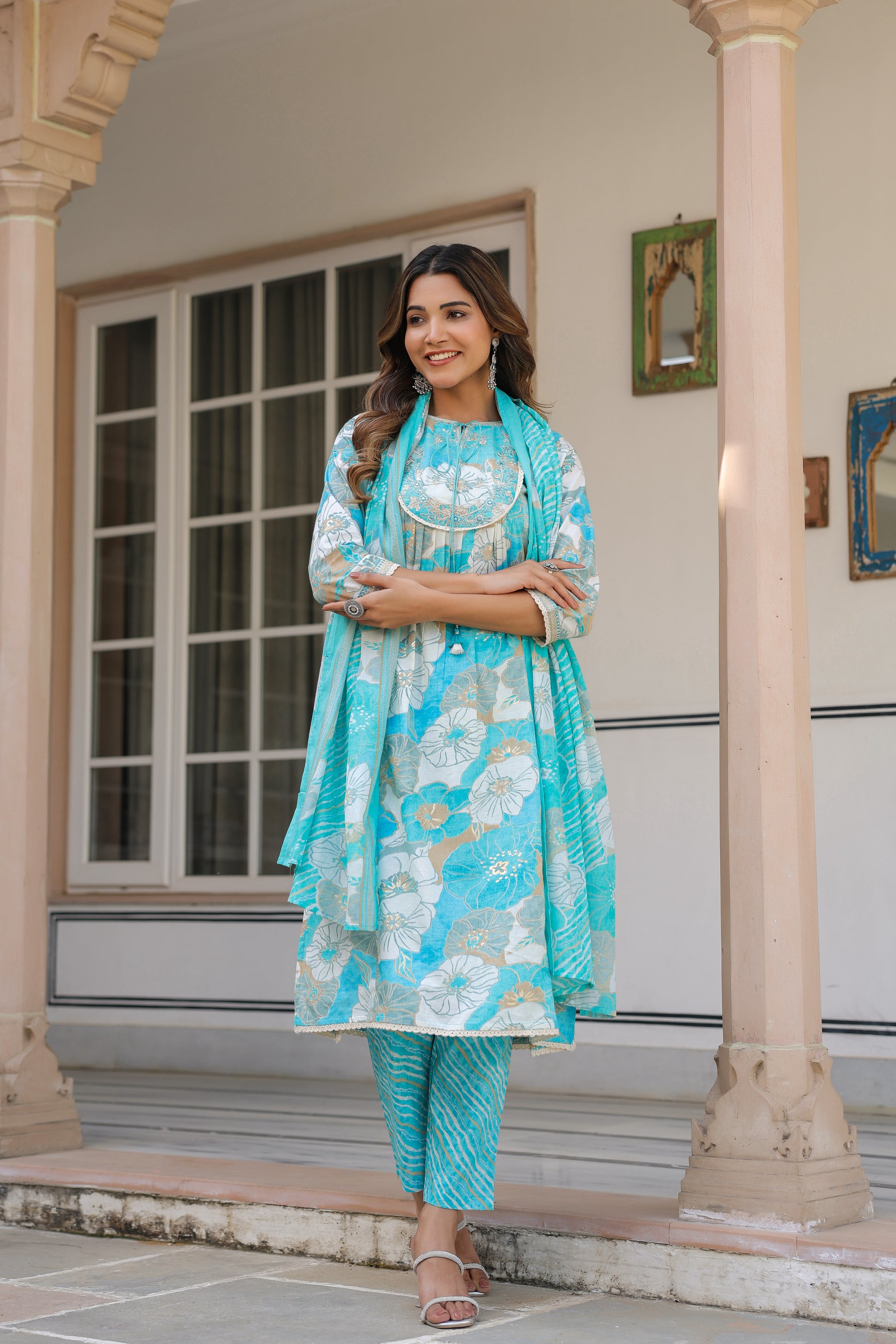 This vibrant kurti set features a stunning blue floral design with an alternate pink color option, perfect for lively occasions. Crafted to offer comfort and style, it enhances your festive wardrobe with a fresh, elegant look that stands out effortlessly. Ideal for adding a cheerful touch to your celebrations.