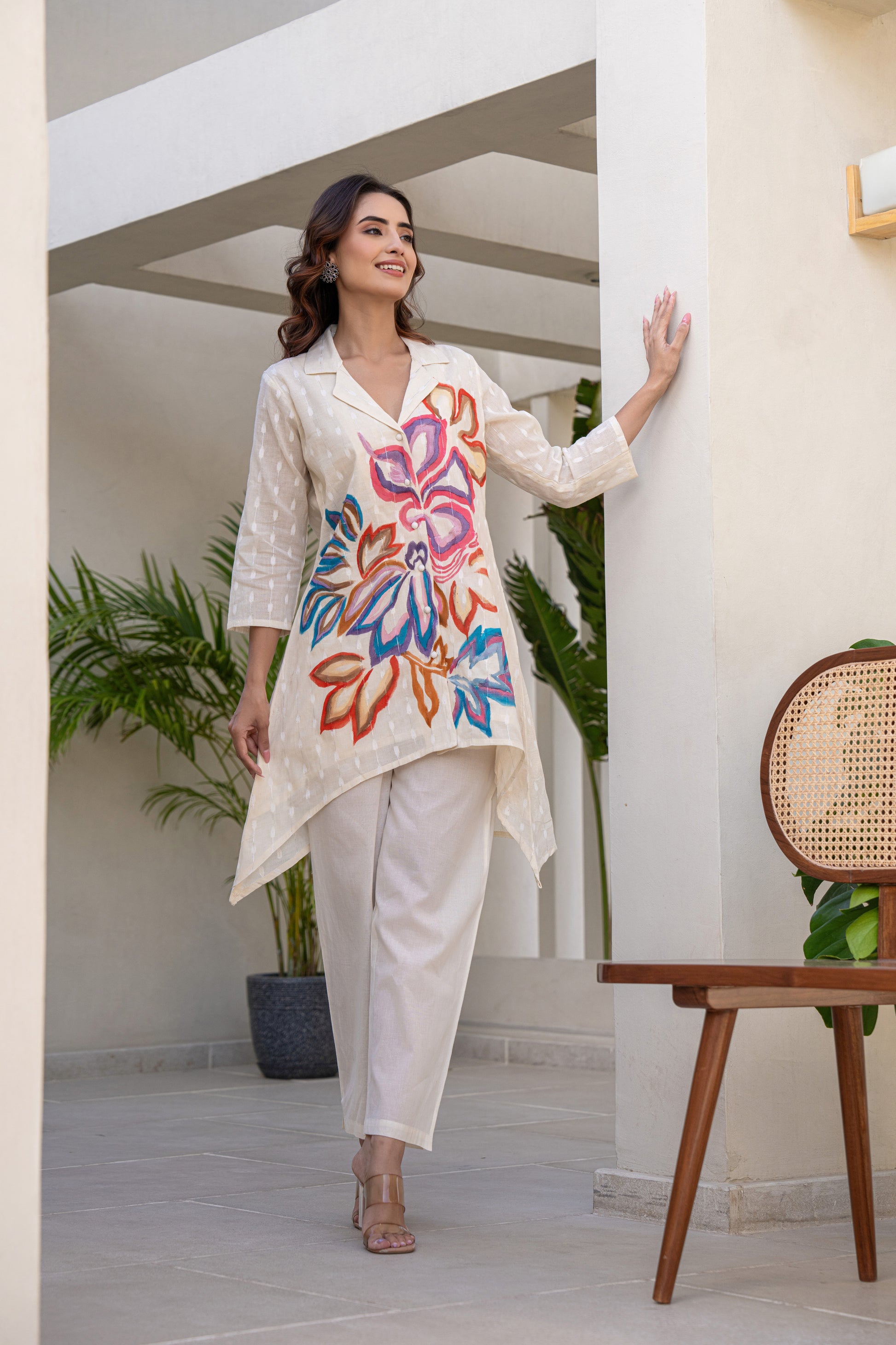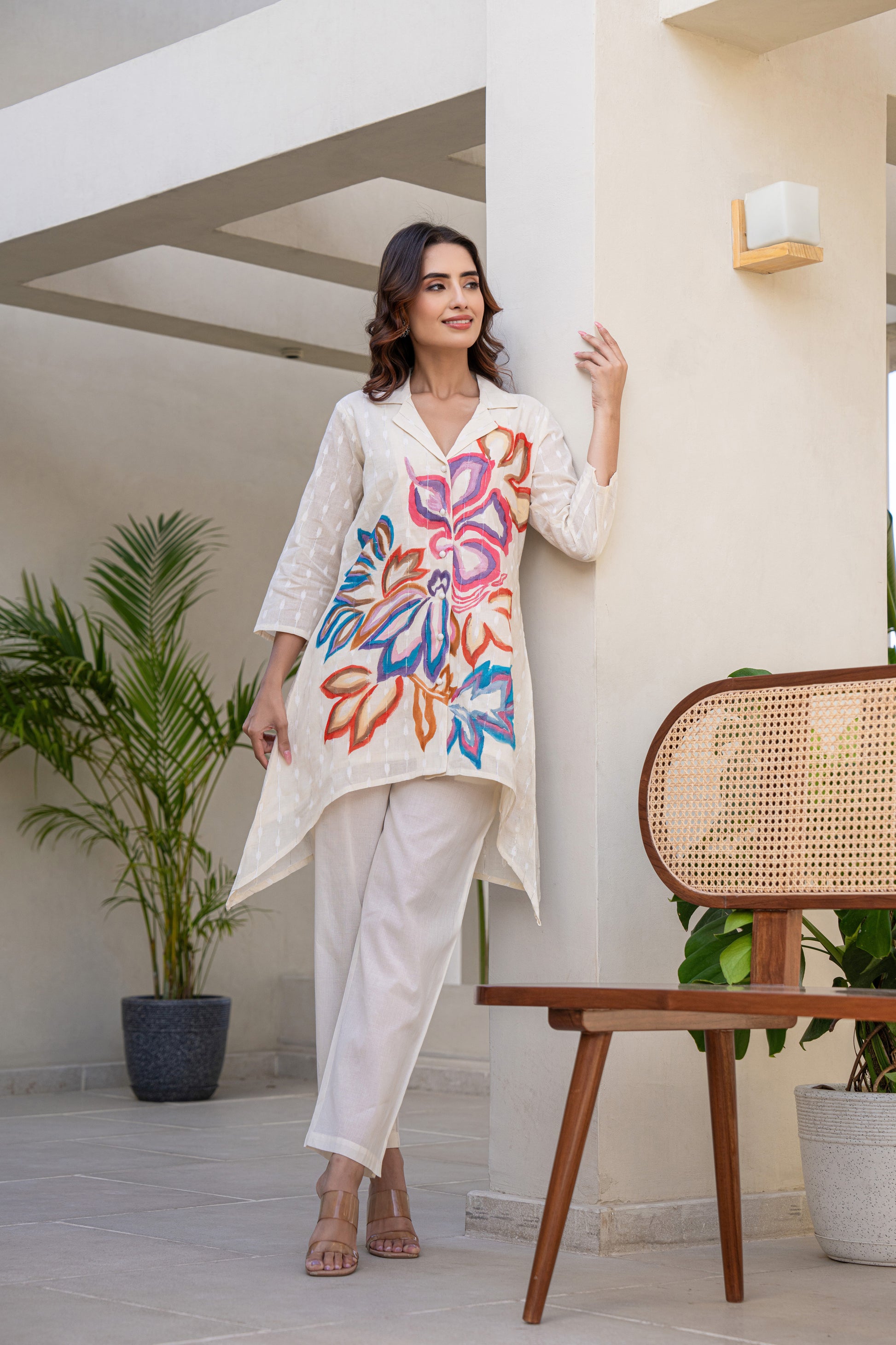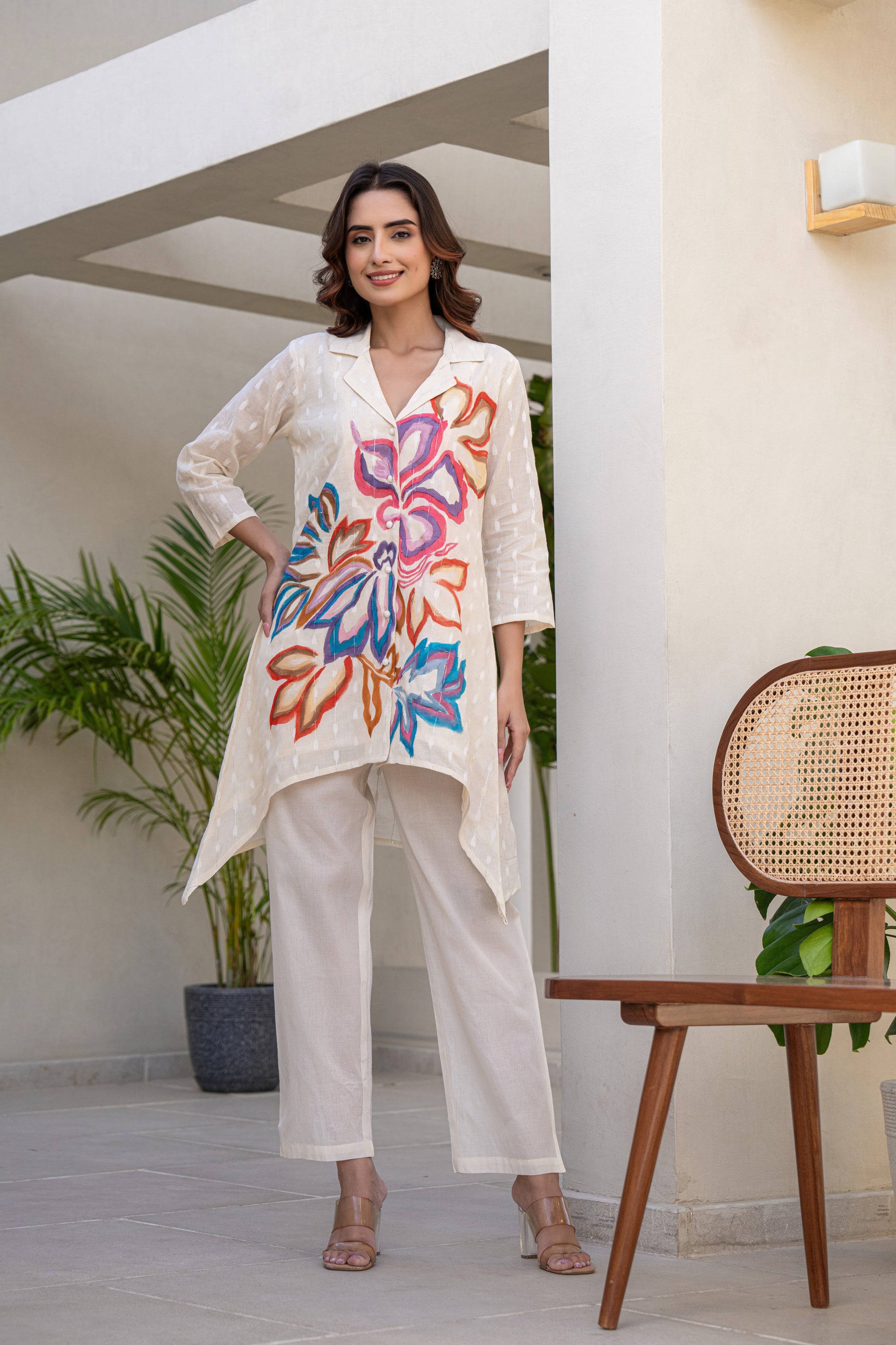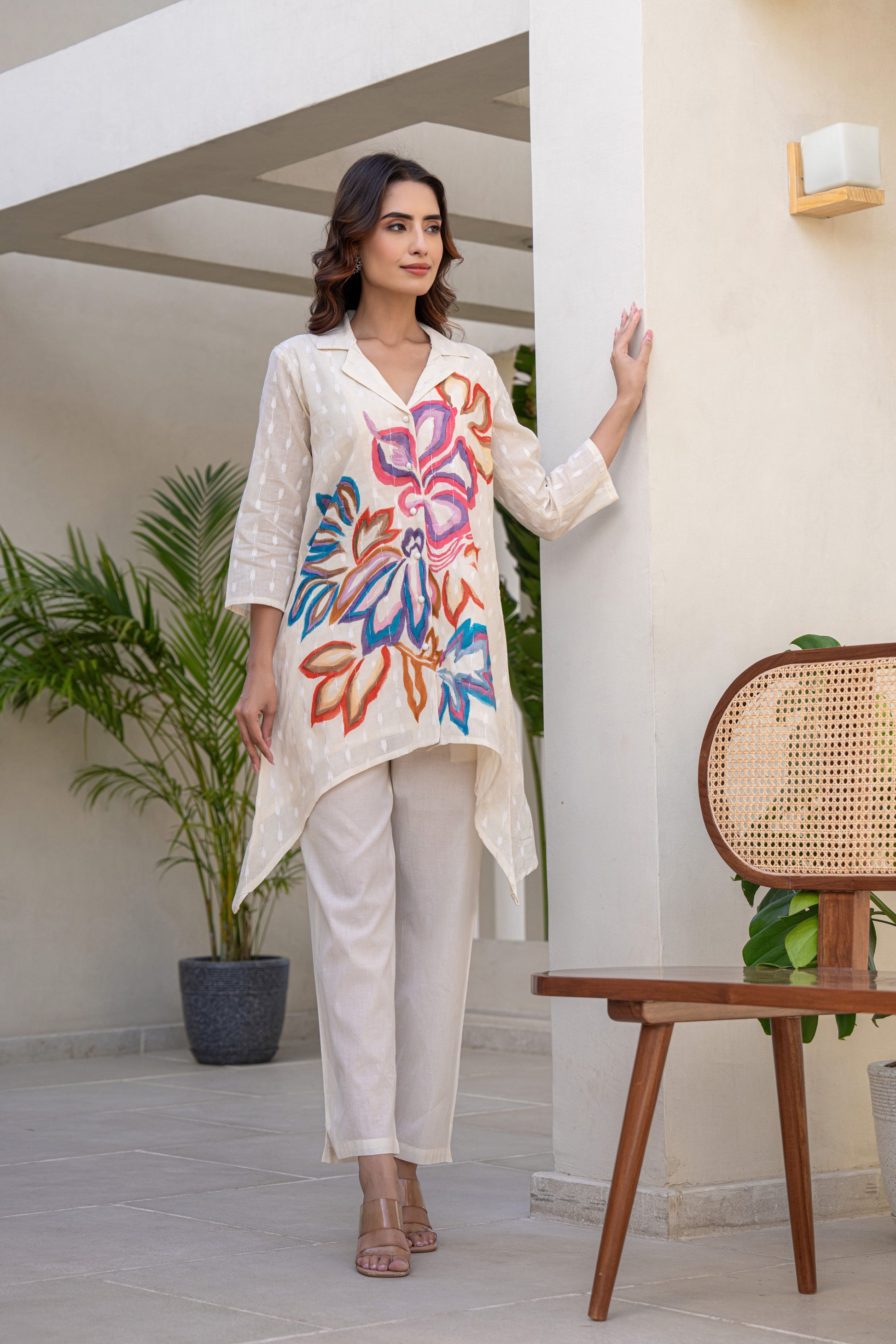 Step into effortless elegance with this ivory co-ord set featuring a flowy asymmetric top and straight-fit pants. Crafted in breathable fabric, the top showcases vibrant hand-painted-style floral motifs that bring a pop of color to your look. The collared neckline and subtle polka-textured base add a refined charm, making it perfect for brunches, festive gatherings, or summer outings. Pair it with nude heels or statement earrings for a chic and contemporary appeal.
