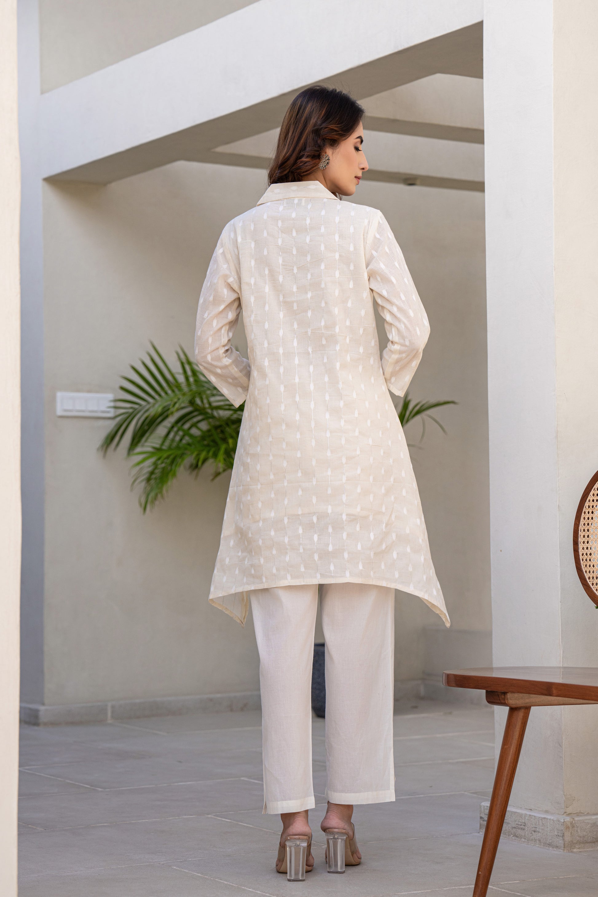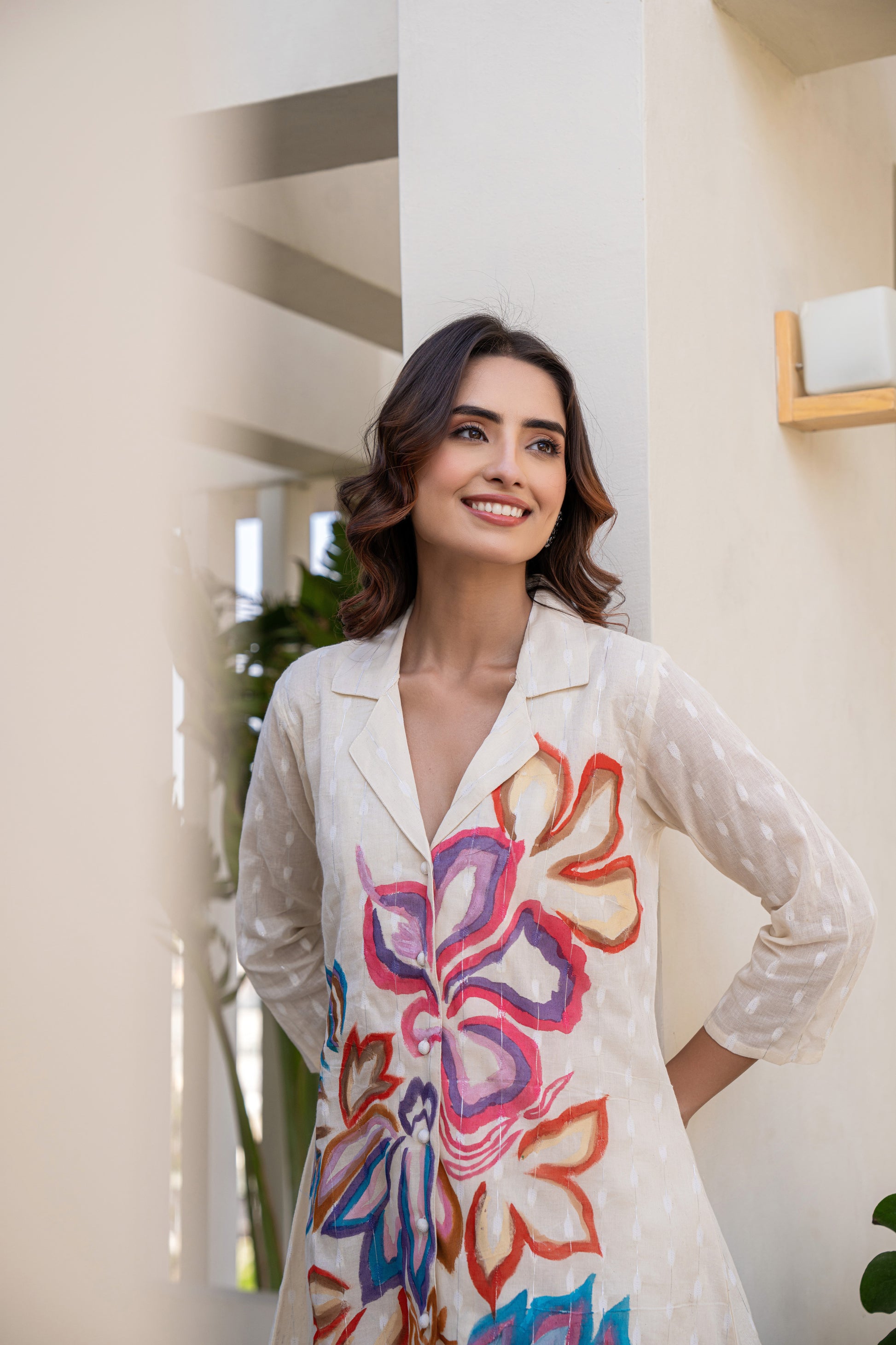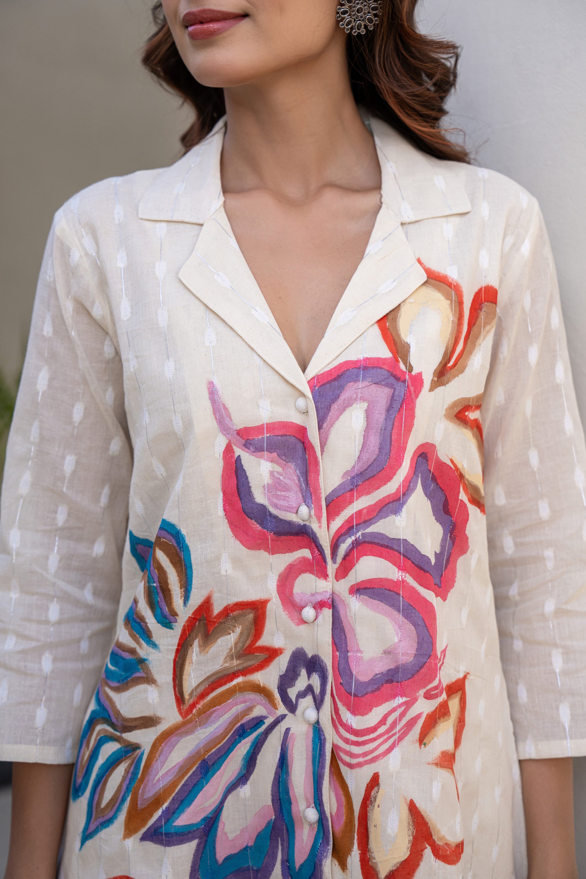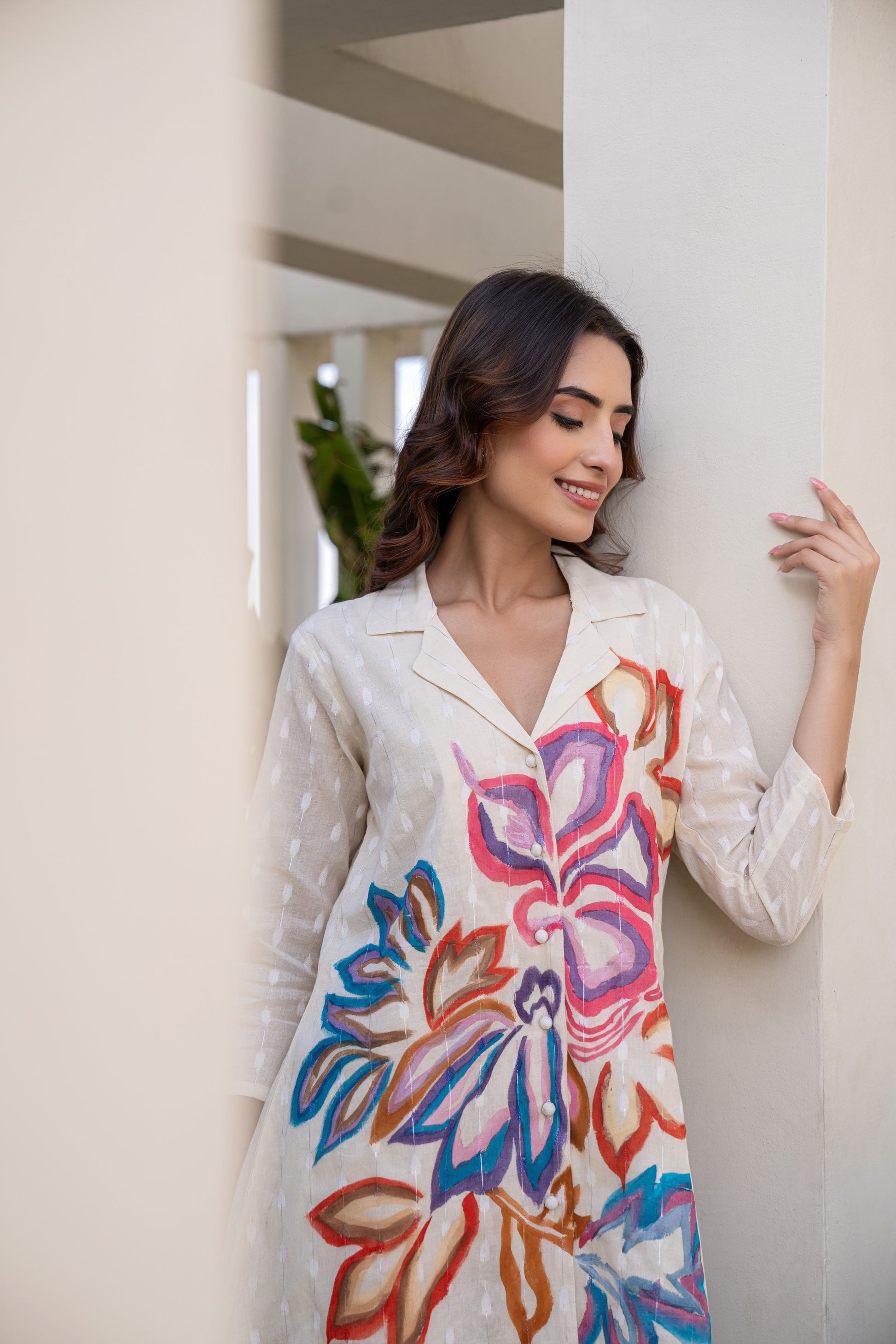 Step into effortless elegance with this ivory co-ord set featuring a flowy asymmetric top and straight-fit pants. Crafted in breathable fabric, the top showcases vibrant hand-painted-style floral motifs that bring a pop of color to your look. The collared neckline and subtle polka-textured base add a refined charm, making it perfect for brunches, festive gatherings, or summer outings. Pair it with nude heels or statement earrings for a chic and contemporary appeal.