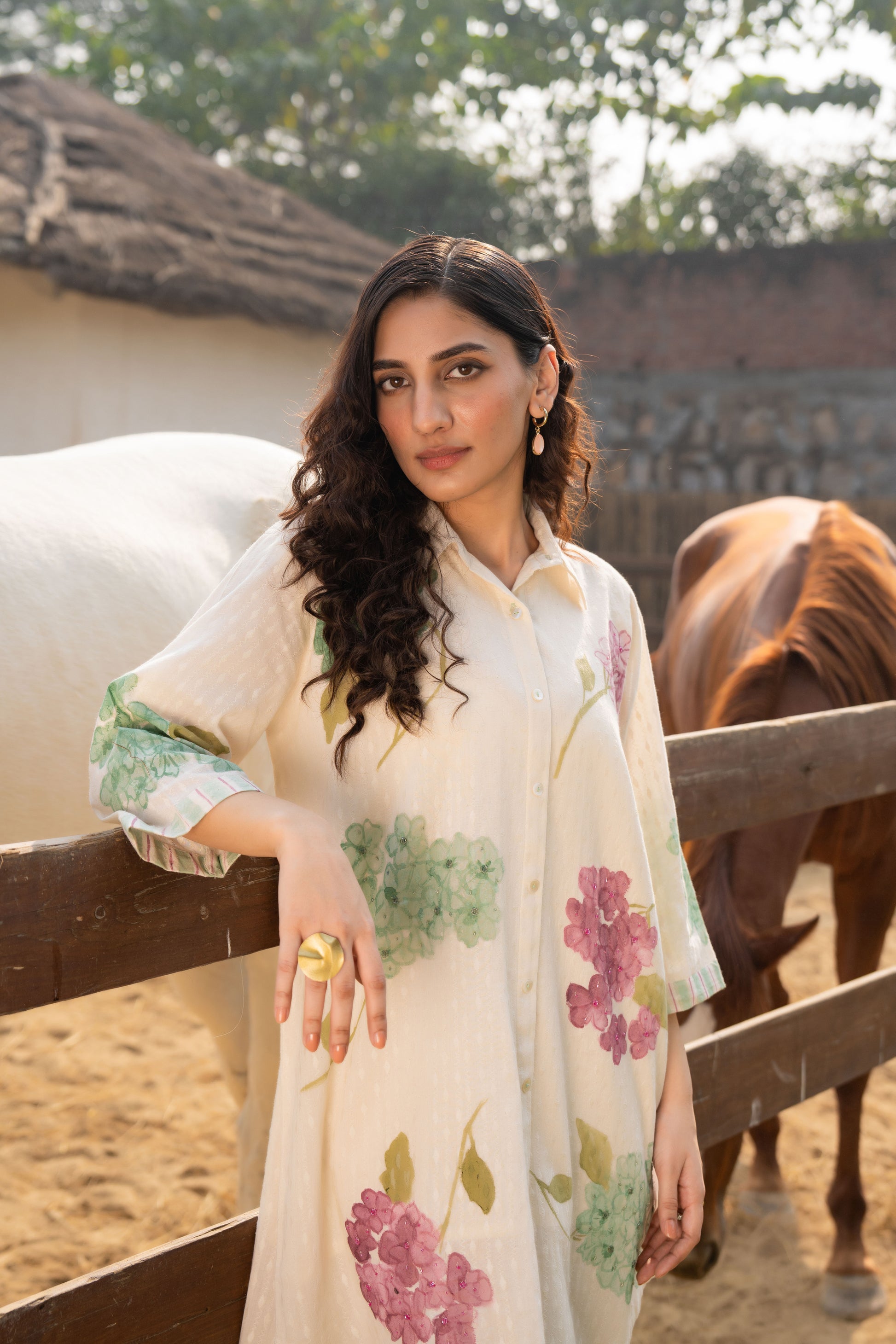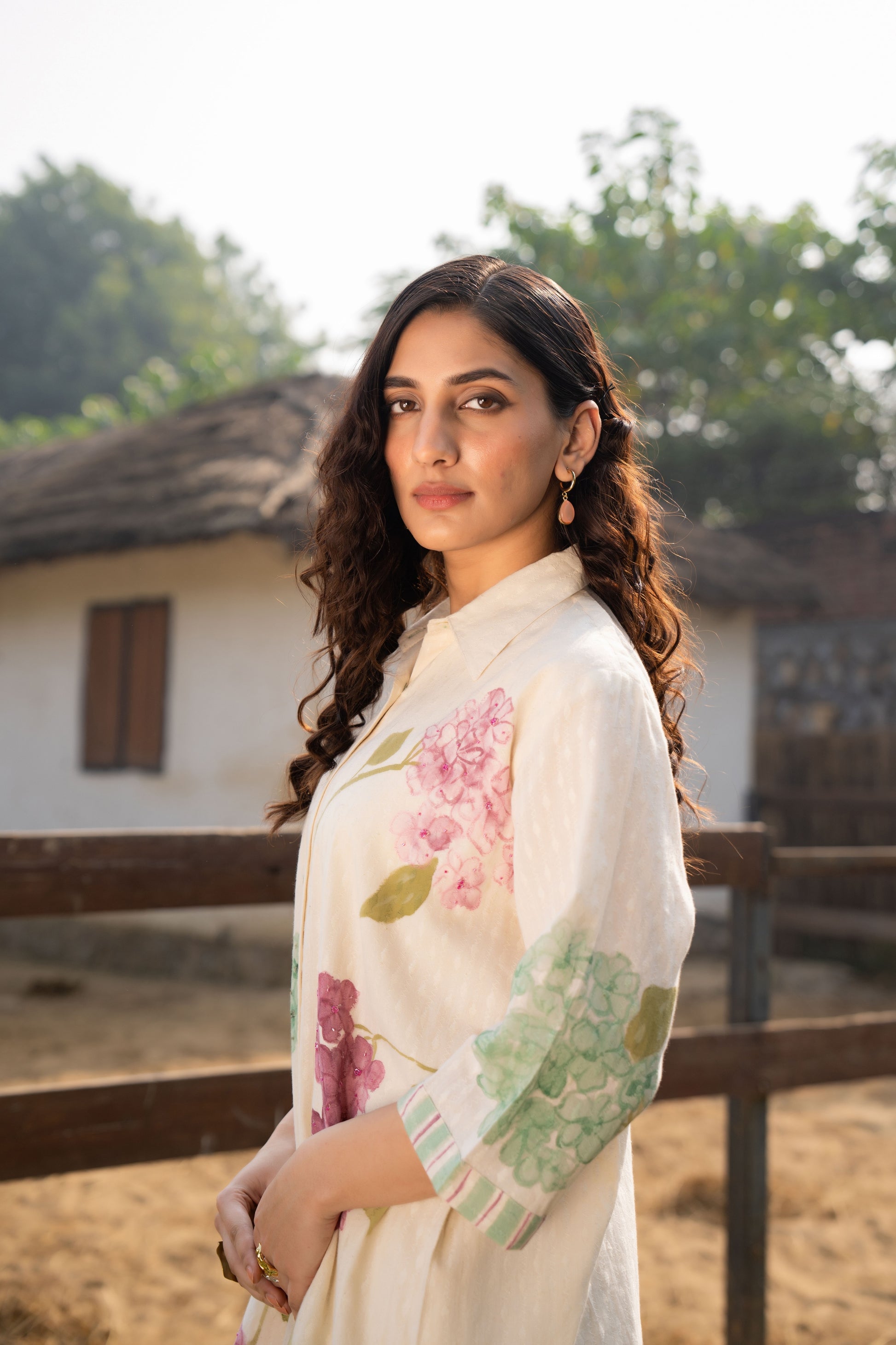 Bask in effortless charm with this ivory co-ord set, featuring delicate floral prints in soothing pastel hues. The collared long shirt and straight-fit pants exude understated elegance, perfect for sunlit days and serene outdoor gatherings. Crafted in soft, breathable fabric, it ensures comfort without compromising on style. Pair it with earthy sandals or minimal jewelry for a graceful, nature-inspired look.